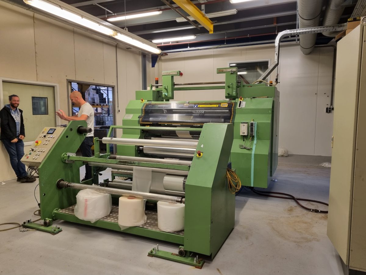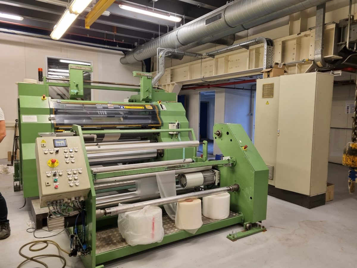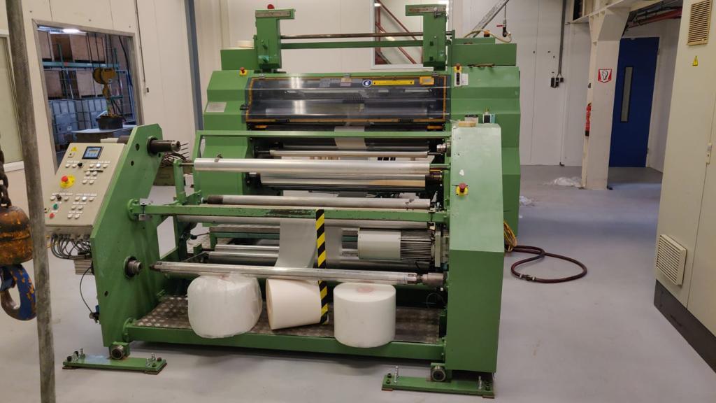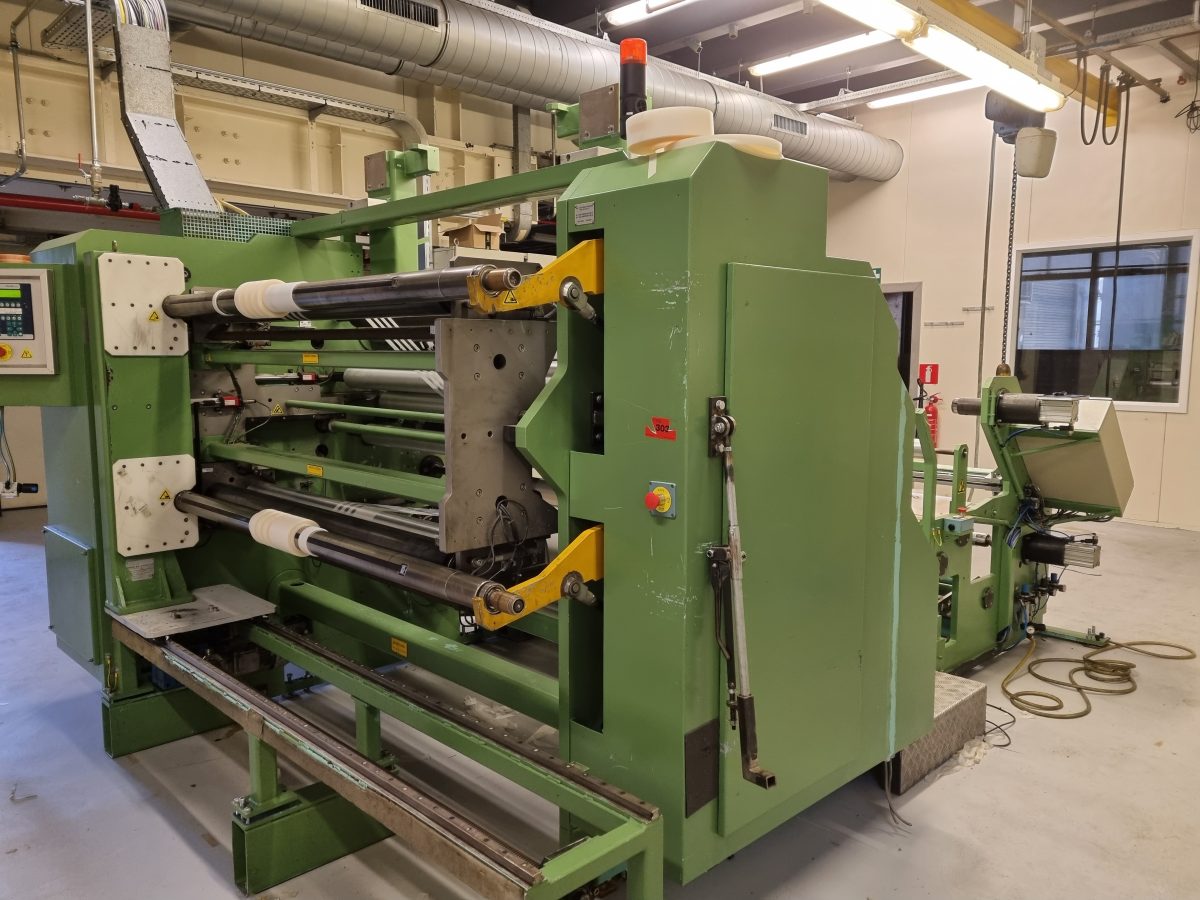 Gute, gebrauchte Anlage zum Umwickeln und Schneiden von Folie, Vlies usw. Rollendurchmesser max. 600mm. Schutzzaun und Rollenhandling vorhanden. Anlage lief bis zuletzt.