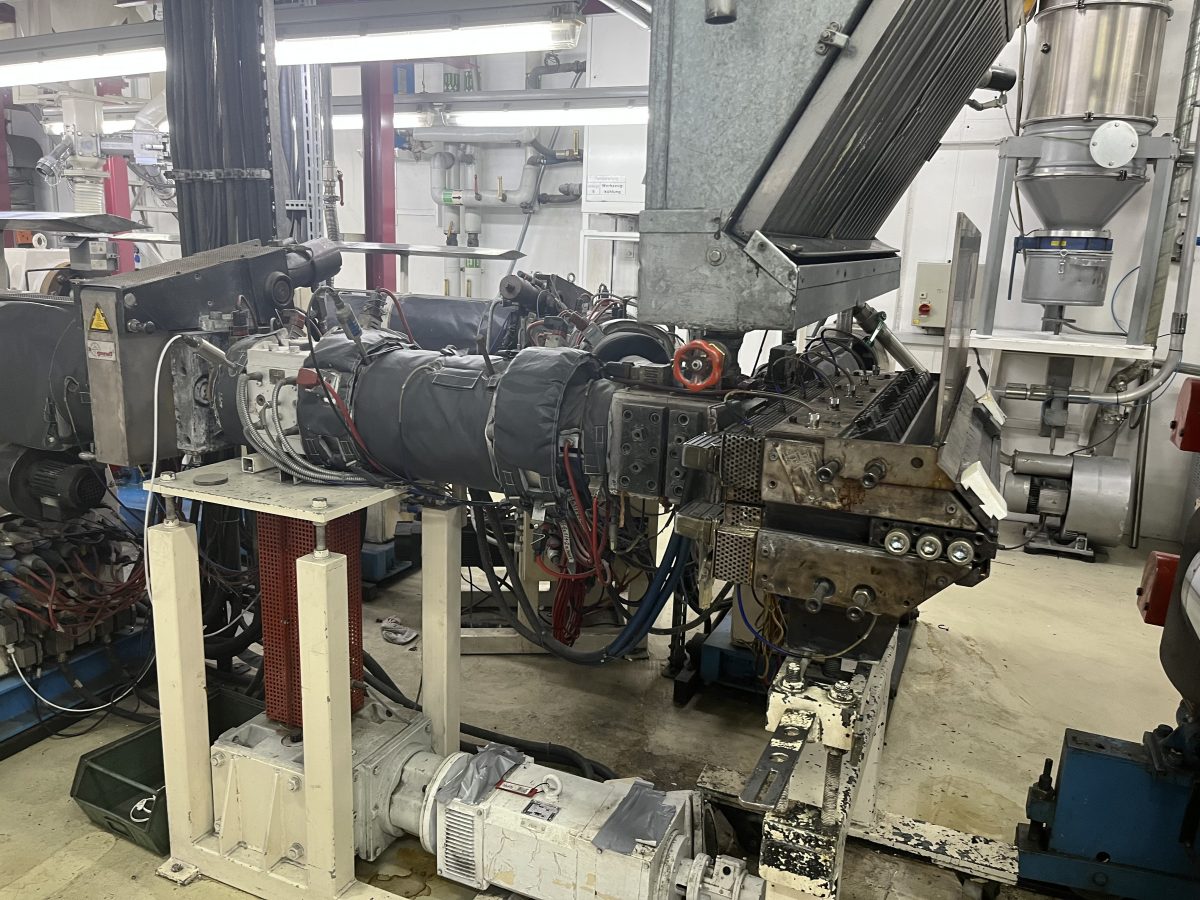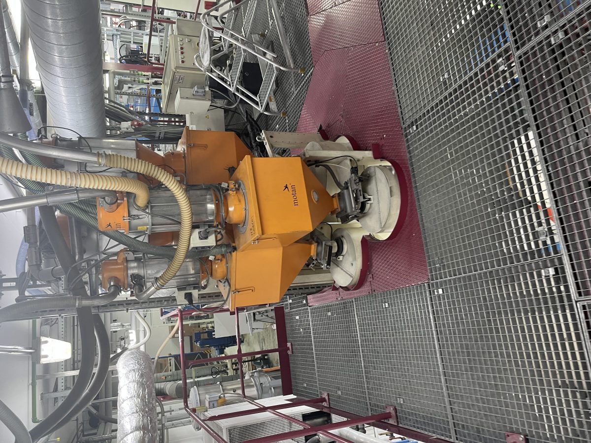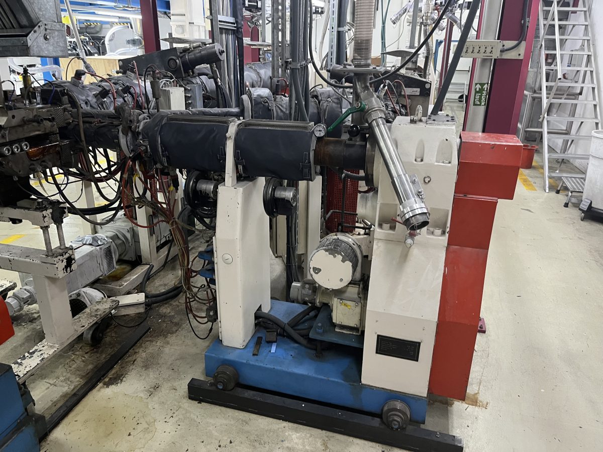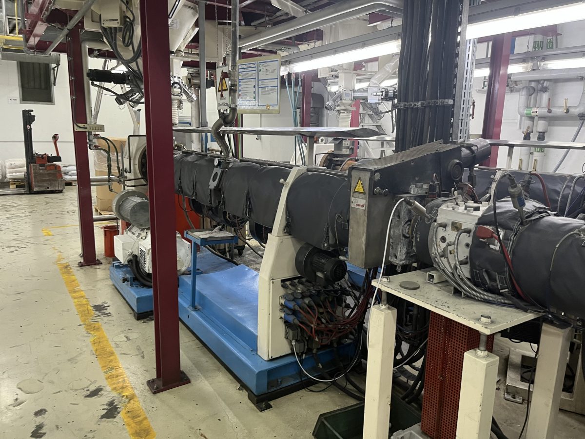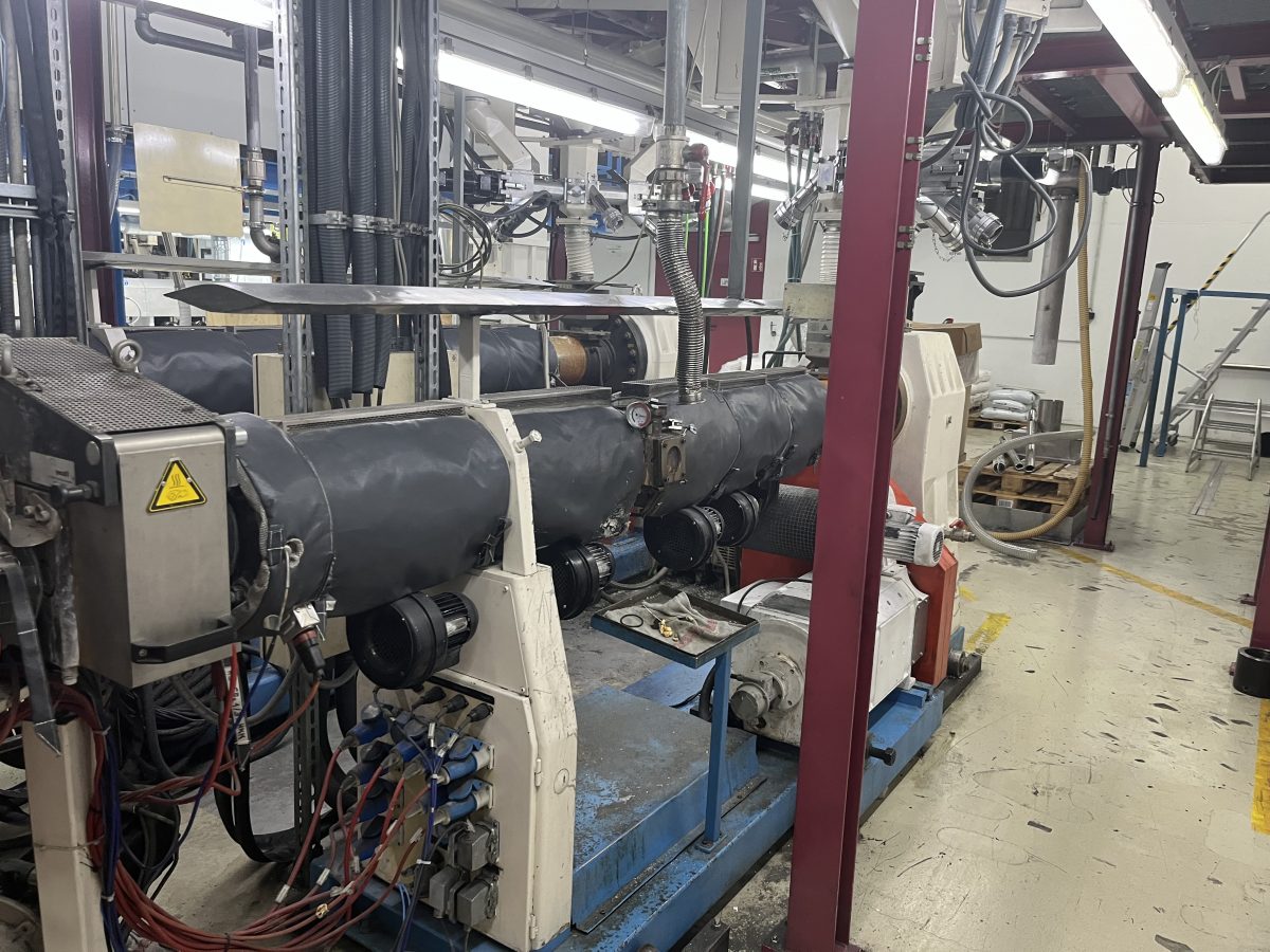 Verkaufen eine gebrauchte Tiefziehfolienanlage von Kuhne. Anlage ist bis zum Schluss gelaufen. Hauptextruder und 2 Co-Extruder. 2 Schmelzepumpen, Siebwechsler, Feedblock, Düse 900mm Glättwerk mit Abzug. Vakuumpumpe für Entgasung. Mischeinheit für auf den Extruder, aber ohne Abscheider. Seitenkanalverdichter mit Staubfilter. HKA´s für Glättwerk und einer Personalbühne für über die Extruder. Anlage und Schaltschrank müssen neu verkabelt werden, da die Kabel zwischen Schaltschrank und Anlage abgetrennt wurden. Kabel konnten nicht zurück gezogen werden. Anlage ist eingelagert und kann besichtigt werden