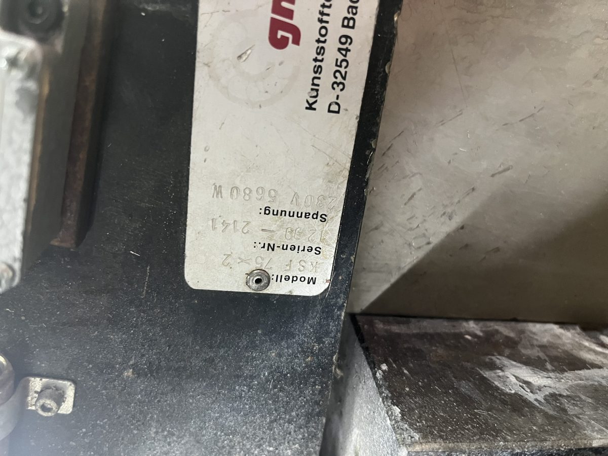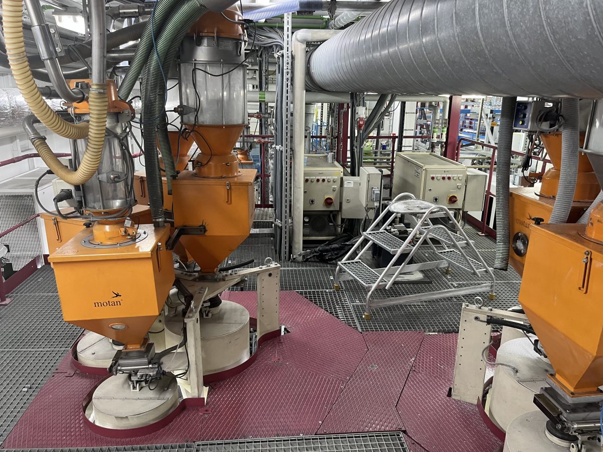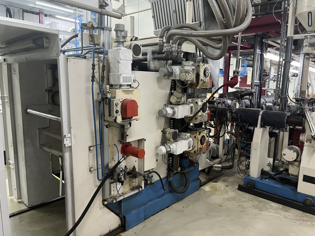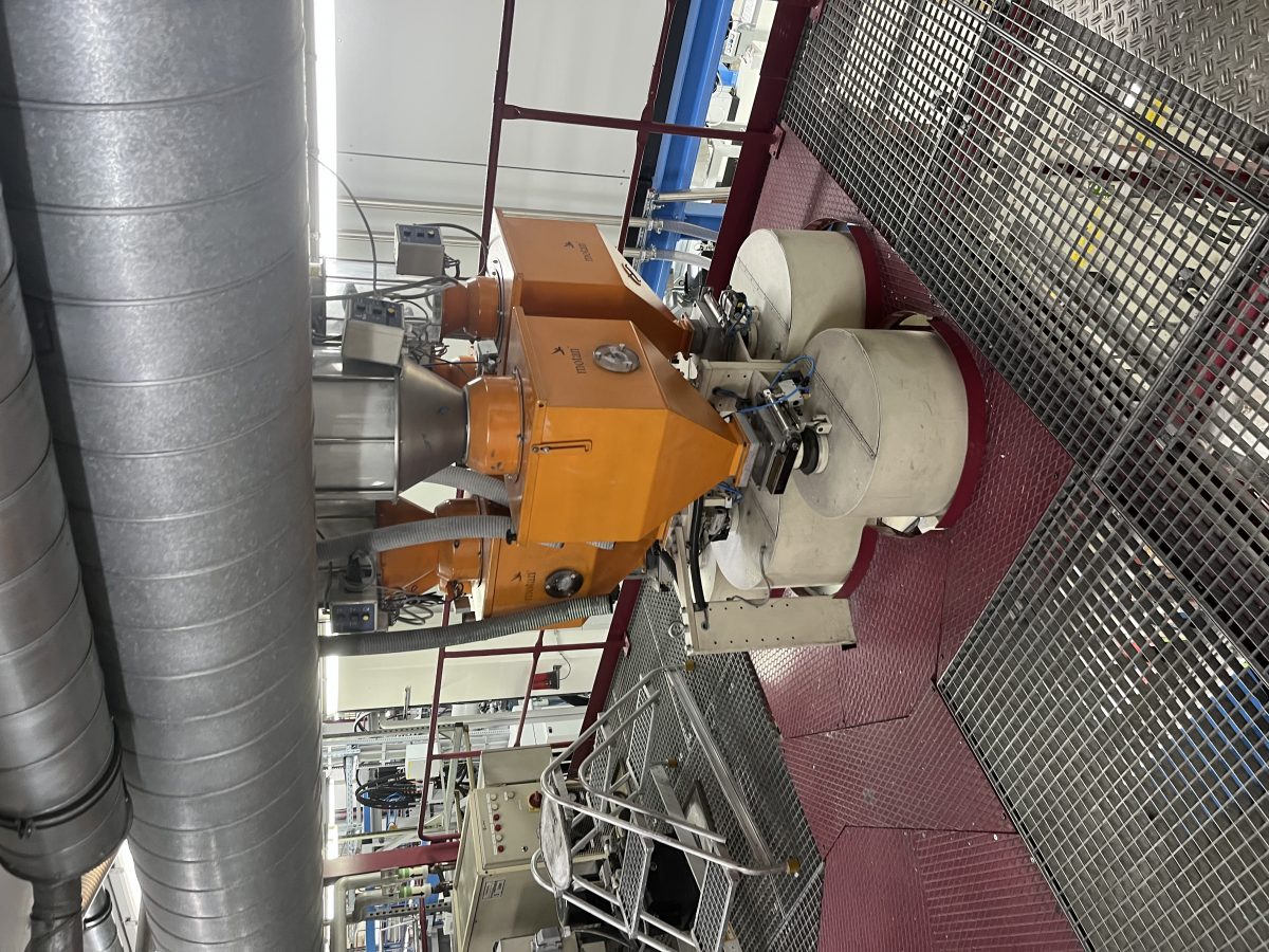 Verkaufen eine gebrauchte Tiefziehfolienanlage von Kuhne. Anlage ist bis zum Schluss gelaufen. Hauptextruder und 2 Co-Extruder. 2 Schmelzepumpen, Siebwechsler, Feedblock, Düse 900mm Glättwerk mit Abzug. Vakuumpumpe für Entgasung. Mischeinheit für auf den Extruder, aber ohne Abscheider. Seitenkanalverdichter mit Staubfilter. HKA´s für Glättwerk und einer Personalbühne für über die Extruder. Anlage und Schaltschrank müssen neu verkabelt werden, da die Kabel zwischen Schaltschrank und Anlage abgetrennt wurden. Kabel konnten nicht zurück gezogen werden. Anlage ist eingelagert und kann besichtigt werden