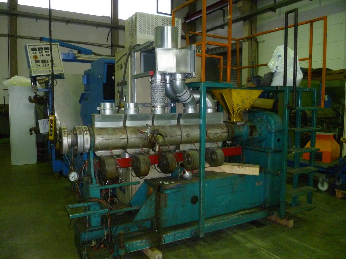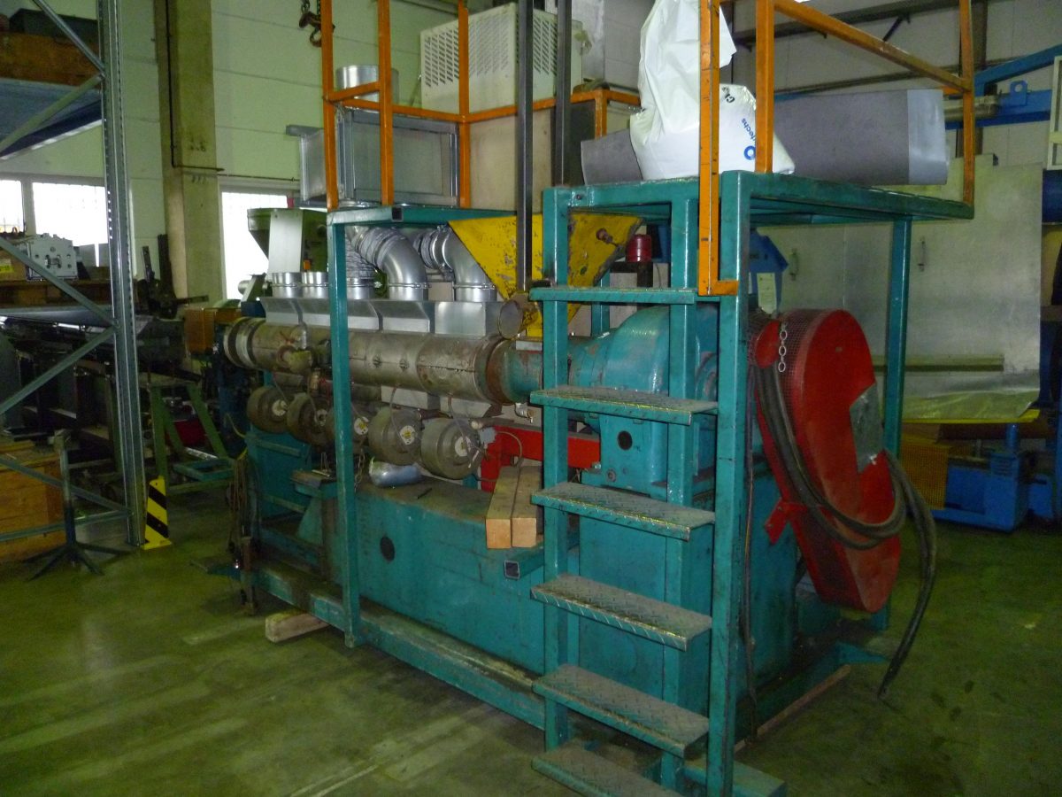 | Leistung: 44 kW, Elektrik und Steuerung sind auf dem Maschinenrahmen, inkl. Schaltschrank (relativ neu). Extruder ist einsatzbereit, für ABS u. PS geeignet, Durchsatz: ca. 60 kg/h |